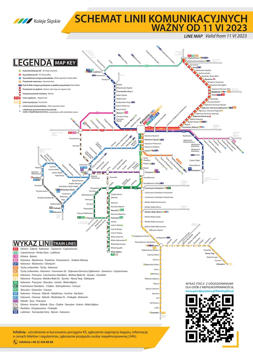 Infolinia o utrudnieniach w kursowaniu pociągów Kolei Śląskich, Biuro Obsługi Klienta, Obsługa osób z niepełnosprawnościami (czynna całodobowo przez 7 dni w tygodniu), tel.: + 48 32 428 88 88.