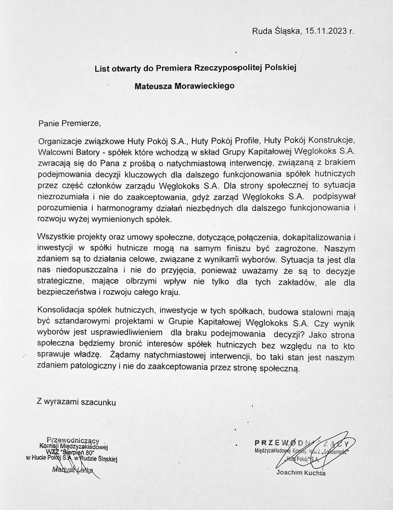 Pod pismem podpisali się: Joachim Kuchta, przewodniczący Międzyzakładowej Komisji Huty Pokój NSZZ Solidarność oraz Mariusz Latka, przewodniczący Komisji Międzyzakładowej Sierpnia 80 w Hucie Pokój w Rudzie Śląskiej.