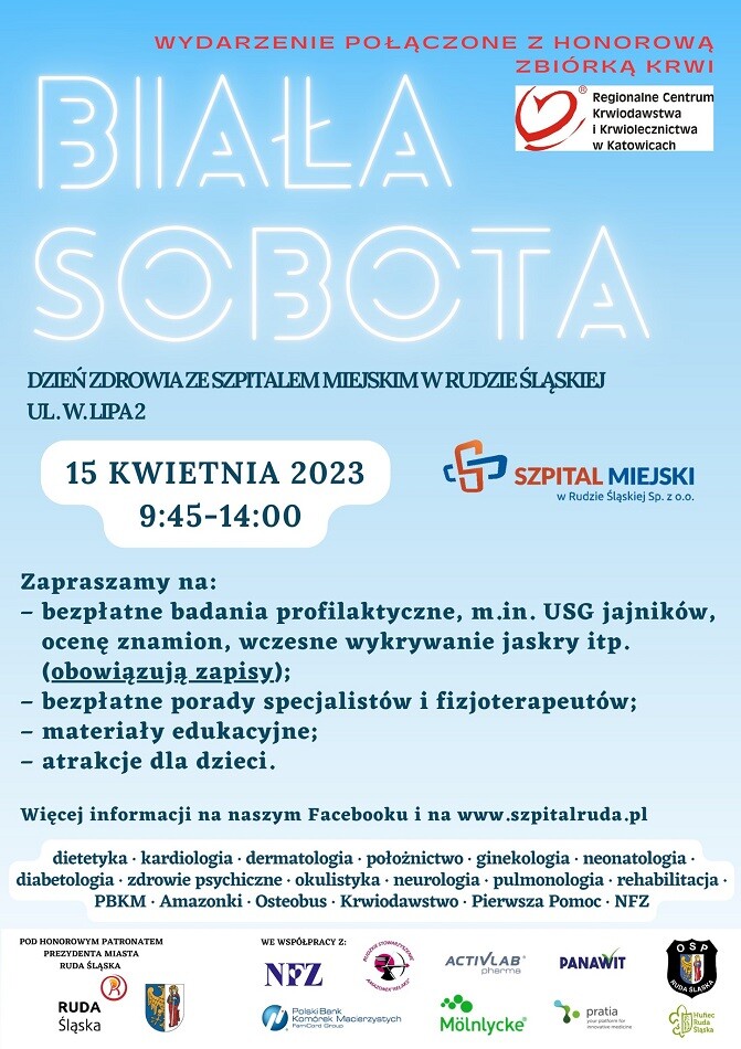 Bezpłatne badania profilaktyczne, porady specjalistów i fizjoterapeutów, a także edukacyjne atrakcje dla dzieci. Tak przedstawia się program "Białej soboty", w Szpitalu Miejskim w Rudzie Śląskiej, która będzie miała miejsce 15 kwietnia w godz. 9:45 - 14:00. Natomiast rejestracja na bezpłatne konsultacje prowadzona będzie od 29 do 31 marca w godz. 10:00 - 14:00 pod nr. tel. 32 779 59 00. Podczas "Białej soboty" w rudzkim szpitalu przeprowadzona zostanie także honorowa zbiórka krwi.