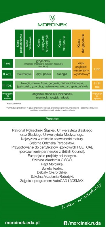 Tutaj naukę można kontynuować w klasie politechnicznej, biznesowej, kreatywnej humanistyki, medycznej i dwujęzycznej. Do wyboru są języki obce takie jak: angielski, angielski w biznesie, francuski, niemiecki, hiszpański, rosyjski i włoski. „Morcinek” oferuje również 11 przedmiotów do wyboru jako rozszerzenie. Klasa kreatywnej humanistyki to pierwsza tego typu inicjatywa. Skierowana jest dla tych uczniów, którzy pragną doskonalić swoje umiejętności w zakresie skutecznego i pięknego mówienia oraz takich, którzy marzą o pisaniu, albo dotychczas pisali do szuflady. Szkoła posiada patronat Politechniki Śląskiej, Uniwersytetu Śląskiego oraz Śląskiego Uniwersytetu Medycznego.