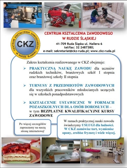 Przeważająca część uczniów szkół zawodowych odbywa praktyczną naukę zawodu w Centrum Kształcenia Zawodowego w Rudzie Śląskiej. Zajęcia odbywają się w czterech doskonale wyposażonych warsztatach przy udziale wysoce wykwalifikowanej kadry. Uczniowie kształcą się na poziomie branżowej szkoły I stopnia oraz technikum w wielu zawodach. Praktyczna nauka zawodu jest realizowana również u pracodawców. Uczeń ma wówczas status młodocianego pracownika.