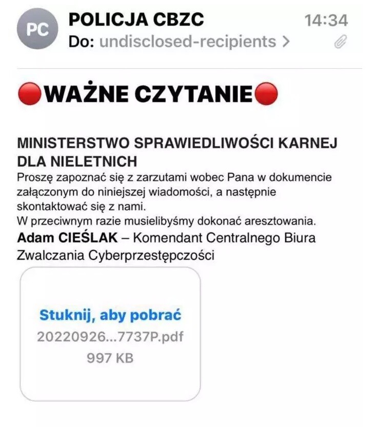 W celu uwiarygodnienia swojej wiadomości przestępcy podpisują się jako Komendant Centralnego Biura Zwalczania Cyberprzestępczości – Adam Cieślak.