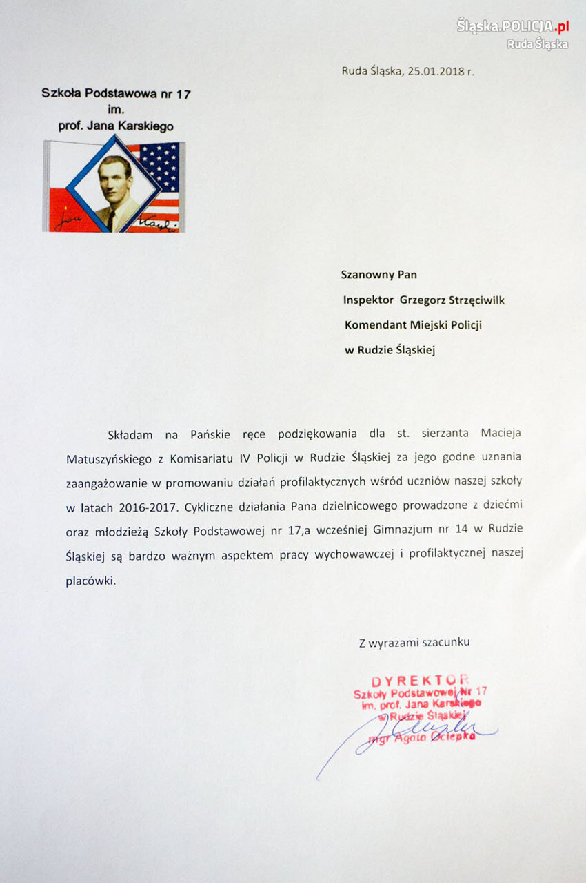 Między innymi takie słowa zawiera list Dyrektora Szkoły Podstawowej nr 17, który trafił na ręce Komendanta Miejskiego Policji w Rudzie Śląskiej.