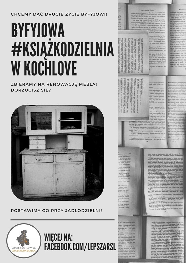 Książkodzielnia to kolejna okazja do tego by nie wyrzucać, a dzielić się! Każdy będzie mógł przynieść zbędną książkę właśnie do tego miejsca, a przy okazji znaleźć dla siebie nową pozycję do przeczytania. Stowarzyszenie zbiera teraz fundusze na remont „byfyja”, który wkrótce stanie najprawdopodobniej obok jadłodzielni w centrum Kochłowic. Aby wspomóc projekt kliknij TUTAJ.